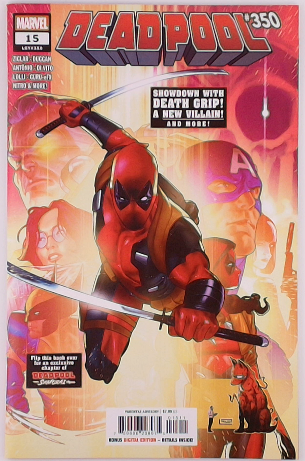 LANDMARK ISSUE #350! DEADPOOL VS. DEATH GRIP! The showdown you've been waiting for, DEADPOOL vs. DEATH GRIP, and only one stands victorious! Then get ready for a 350th celebration like only the 'Pool can bring you, with anniversary stories from Deadpool legends Gerry Duggan and Matteo Lolli introducing an ALL-NEW VILLAIN, a peek into Doug and Princess' own adventure, and an ALL-NEW installment of DEADPOOL SAMURAI from the creators of the hit manga! RATED PARENTAL ADVISORY. Rated T+