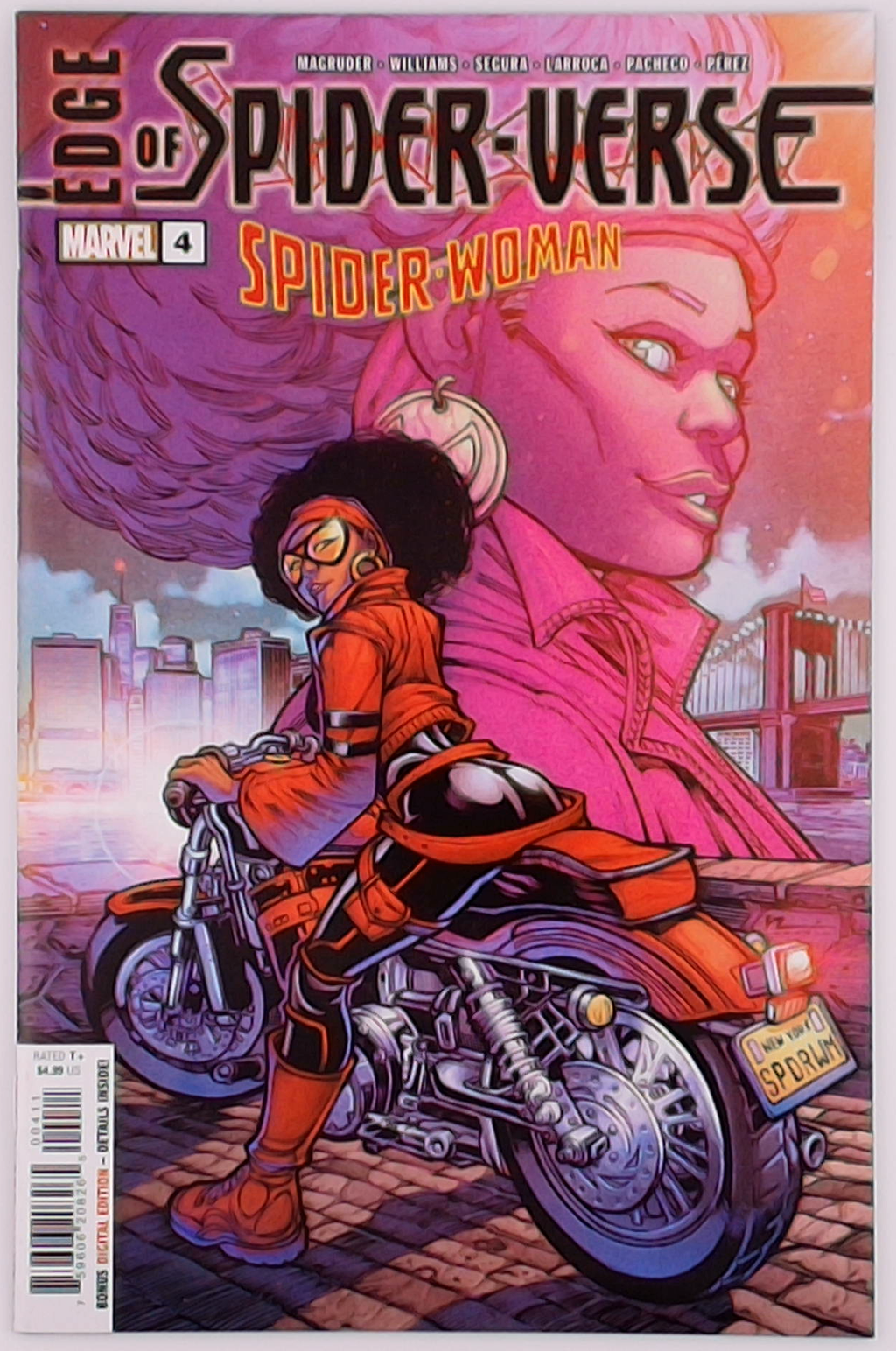 Witness the comic-book debut of the SPIDER-WOMAN from the smash hit ACROSS THE SPIDER-VERSE MOVIE! That's right, the Jessica Drew that stole that great movie is coming to the comics with a story from NILAH MAGRUDER and MARCUS WILLIAMS working with the filmmakers! And if that's not enough, witness the true birth of the Spider-Society setting up the next SPIDER-VERSE storytelling epic! Rated T+