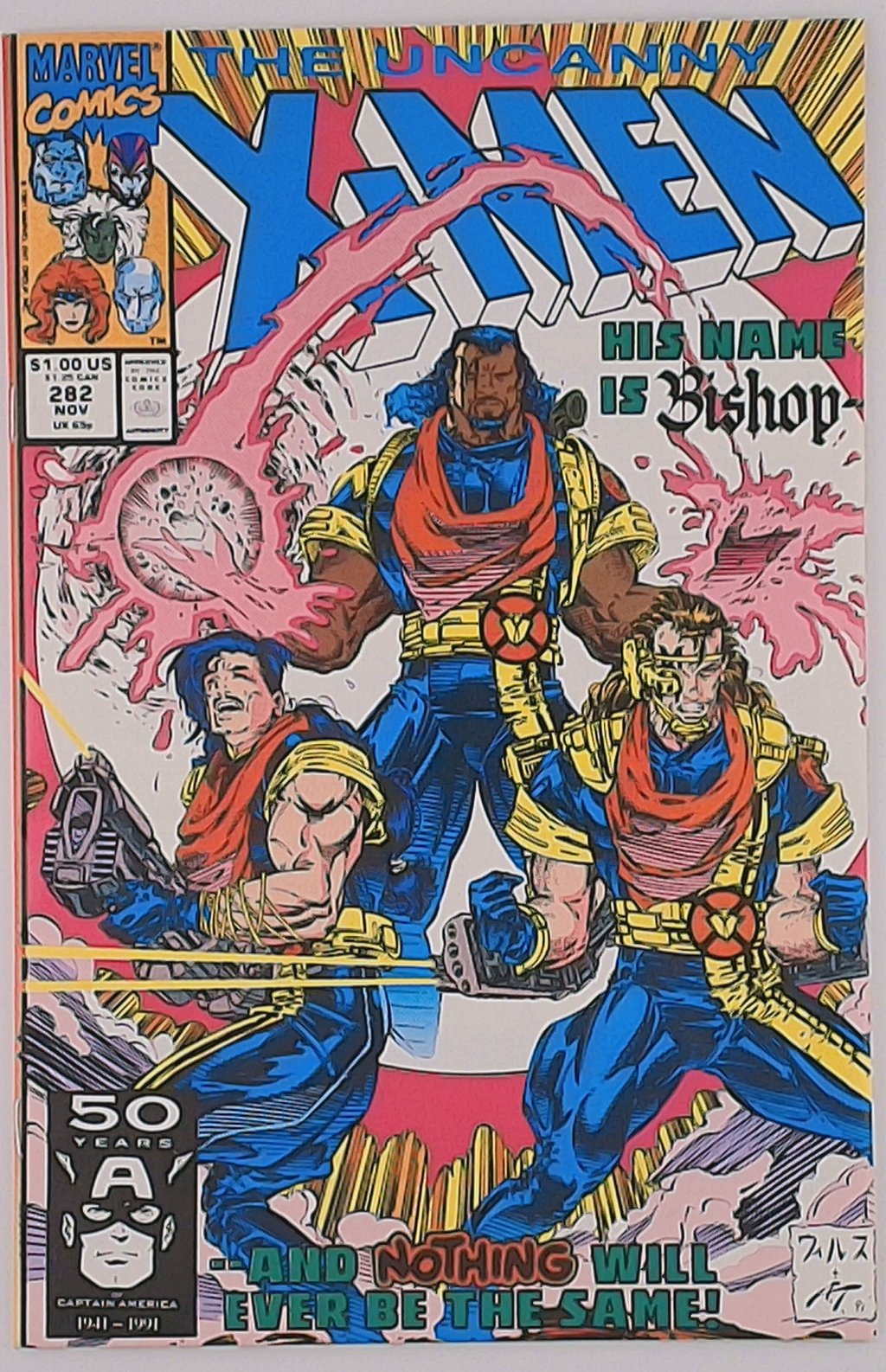 Direct Edition. "Payback!" Story by Whilce Portacio and John Byrne. Art by Whilce Portacio and Art Thibert. In one fell swoop the Upstarts have destroyed the Reavers and crippled the Hellfire Club. Next up, the Mutant Liberation Front. Who can stop these powerful new foes? Enter: Bishop!