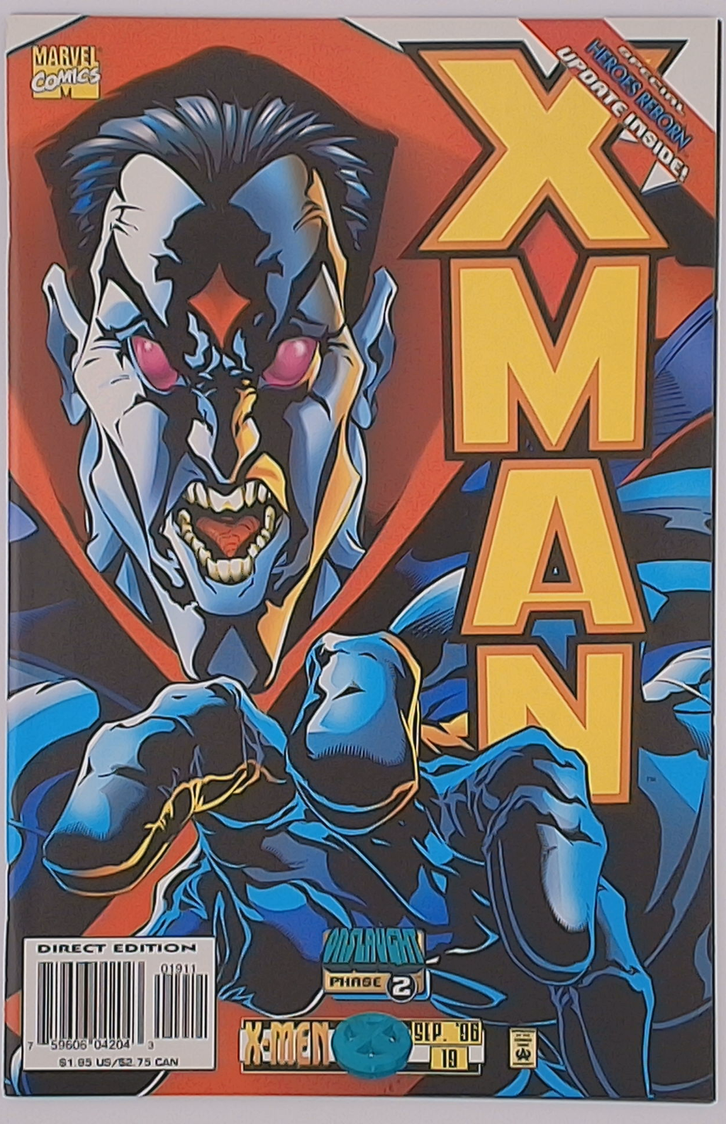 Onslaught Phase 2 - "Shades of Grey!" Story by Terry Kavanagh. Art and cover by Steve Skroce. Story continued from X-Force (1991-2002 1st Series) #57. The powerful mutant Onslaught makes his move but before he can accomplish his master plan he needs the X-Man, and not even Mr. Sinister will stand in his way. Story continues in X-Men #56. Includes a 6-page Heroes Reborn Preview of Iron Man and the Avengers.